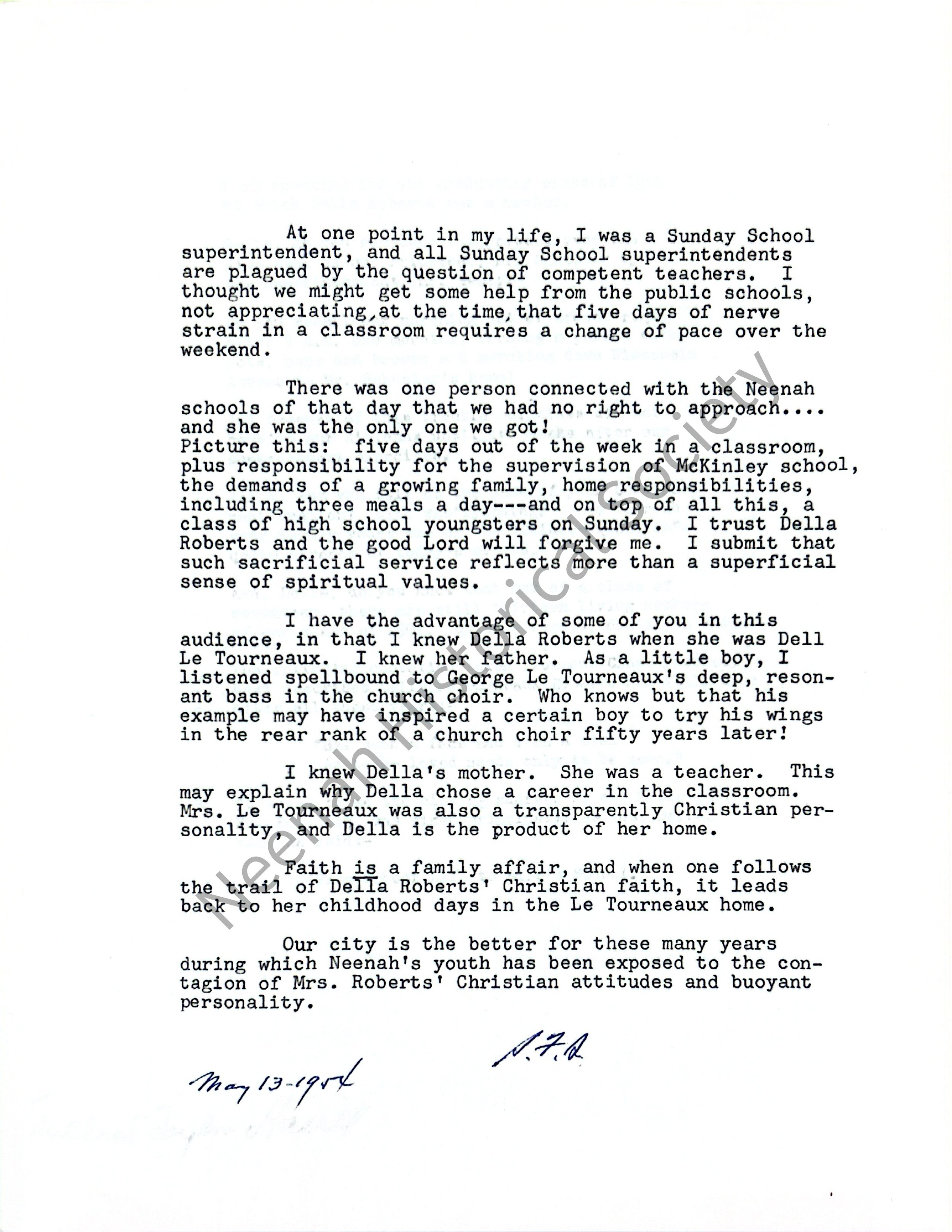 The letter is in a retirement scrapbook for Helen Roberts at the Neenah Historical Society.